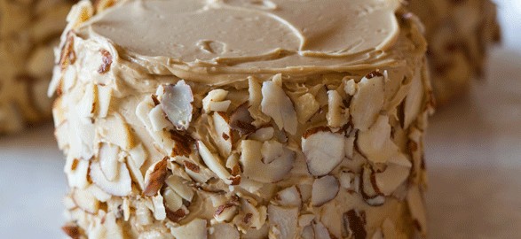 11. Place cakes in fridge and allow the cakes to chill, about 2 hours. Place another even layer of frosting around each cake and coat the sides with the toasted almonds. Serve.