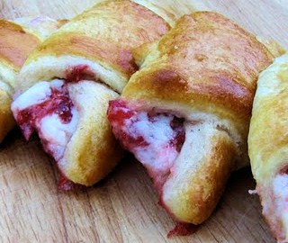 Unroll each crescent roll. On the fattest part of the triangle place 1 tsp on cream cheese mixture and one tsp of jam. Roll into a croissant shape.