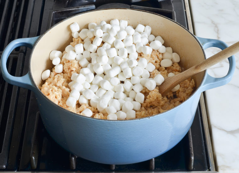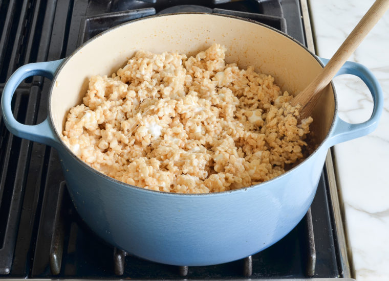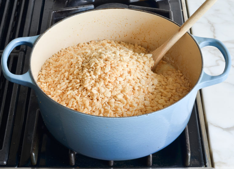 Place the pot back over medium heat and stir the mixture with a wooden spoon until the marshmallows are completely melted. Remove the pan from the heat and add the cereal. Using a rubber spatula or wooden spoon, stir until evenly combined.