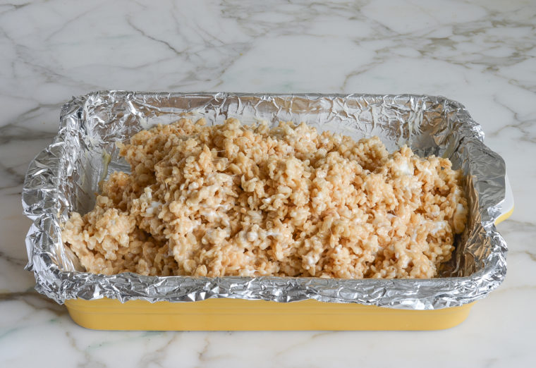 Add the reserved marshmallows and stir until they are softened and partially melted. Don't overmix; you want pockets of goo. Transfer the mixture to the prepared pan and, using the butter wrapper or damp fingers, press the mixture gently into an even layer in the prepared baking pan. Let cool at room temperature for at least an hour.