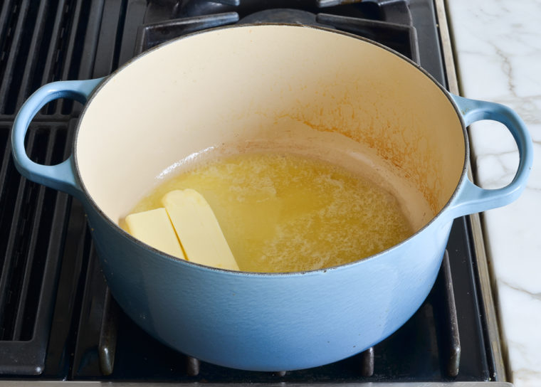 Begin by melting the butter in a large pot over medium-high heat.