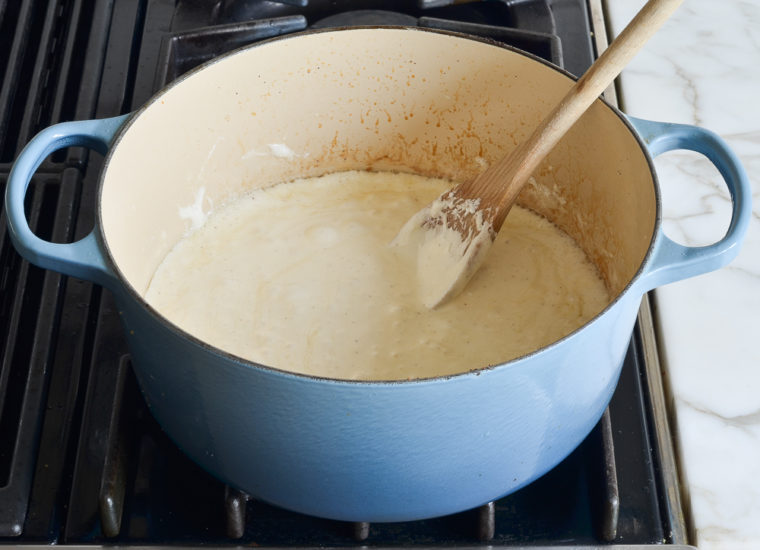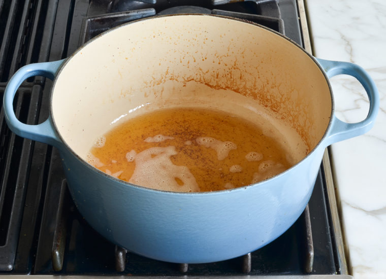 You’ll see little bits of golden brown sediment forming; that’s okay. But if they get too dark, go ahead and strain them out and then pour the brown butter back in the pot.