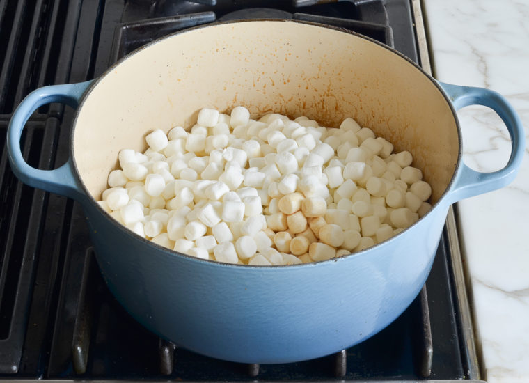 Place the pot over medium heat and stir the mixture with a wooden spoon until the marshmallows are completely melted.