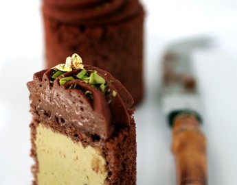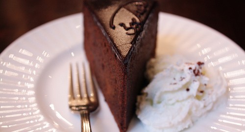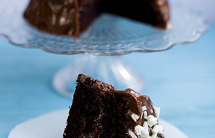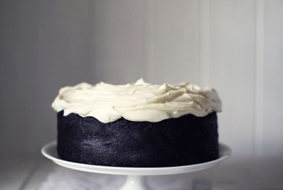 Looks like there’s a thin layer of dark chocolate icing that was poured over the entire cake. Then a light sprinkle of powdered sugar below a flowery design made with dark chocolate drizzle. Link