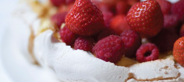 Pudding heavily sprinkled with powdered sugar, topped with fresh berries. Link
